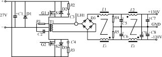 滤波电感L1和L1'共绕在同一个CD形的铁心上,电感量为1.0mH。在连接上,L1和L1'是串联电感的形式,这样可以提高电感量,并能确保对地输出动态和静态特性均较好的±130V电压。L2和L2'是一组辅助滤波电感。