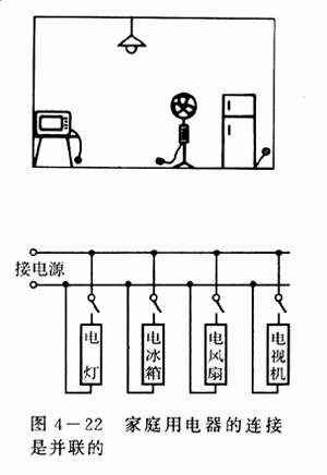 每当国庆节的夜晚,首都北京的天安门以及高大建筑物,都要用成千只灯泡装点起来(参见彩图4),点亮的灯泡映出建筑物的轮廓,显得美丽、壮观、这些灯泡都是非联的。在我们的家庭中,像电灯、电风扇、电冰箱、电视机等用电器都是并联在电路中的(图4-22).