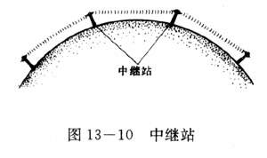 微波很容易放地面吸收,又能穿透电离层而不被反射,所以它不能靠地波和天波传播,只能直线传播。由于地球表面不是平面,微波在地球表面传播的距离不大,一般只在几十千米。因此,要向远距离传播微波,就要设立中继站,像接力赛跑那样,一站接一站地把微波传送出去(图13-10)。