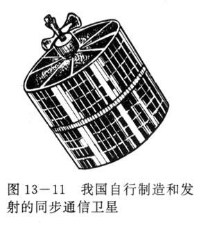 有了同步通信卫星以后,微波的传送多了一个好办法同步通信卫星在赤道正上空,绕地心转动的周期和地球自转的周期一样。从地球上看,它是在赤道上空某处静止不动的。用同步通信卫星做中继站,可以使从它转发的微波达到地球上很大的范围只要有三颗同步通信卫星,就可以差不多在全世不范围内转播各地的电视节目。我国已发射同步通信卫星(图13-11),用来转播电视和无线电话。